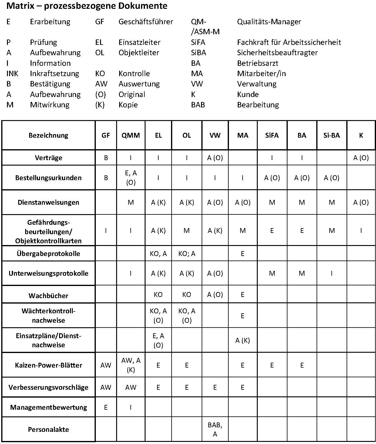 • Die Frist zur Aufbewahrung der Dokumente ist in den Qualitätsaufzeichnungen und in der Dokumentenmatrix festgelegt. Verantw.: siehe Matrix