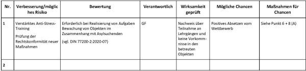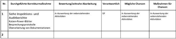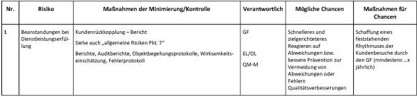 Diese Datei listet alle Risiken und Maßnahmen die zur wirksamen Steuerung des Qualitätsmanagementsystems notwendig sind. Sie ist eines der zentralen Nachweis‐dokumente. Korrekturmaßnahmen werden in einem Report abgearbeitet und im Anschluss im Teil Korrekturmaßnahmen gelistet.